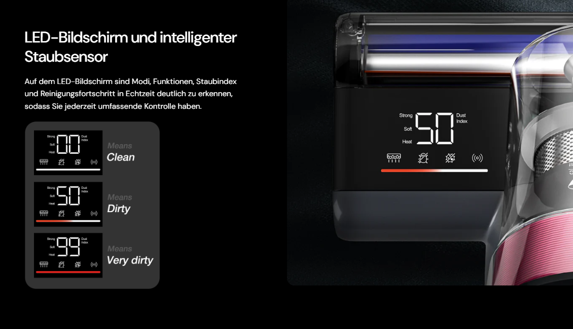 Der integrierte Sensor analysiert in Echtzeit die Staubmenge und zeigt diese als übersichtlichen Index (0%-99%) auf dem LED-Display an. So sehen Sie genau, wann die Oberfläche sauber ist.