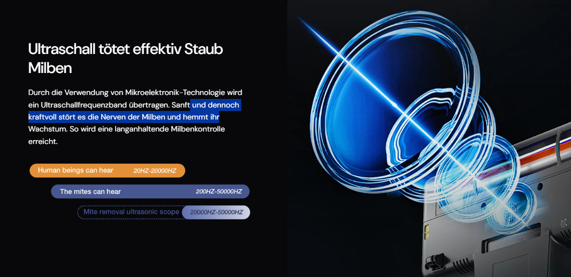 In Kombination mit der Hochfrequenz-Klopftechnik werden tiefsitzende Verschmutzungen, Milben und Staub schonend und gründlich aus allen Textilien gelöst.