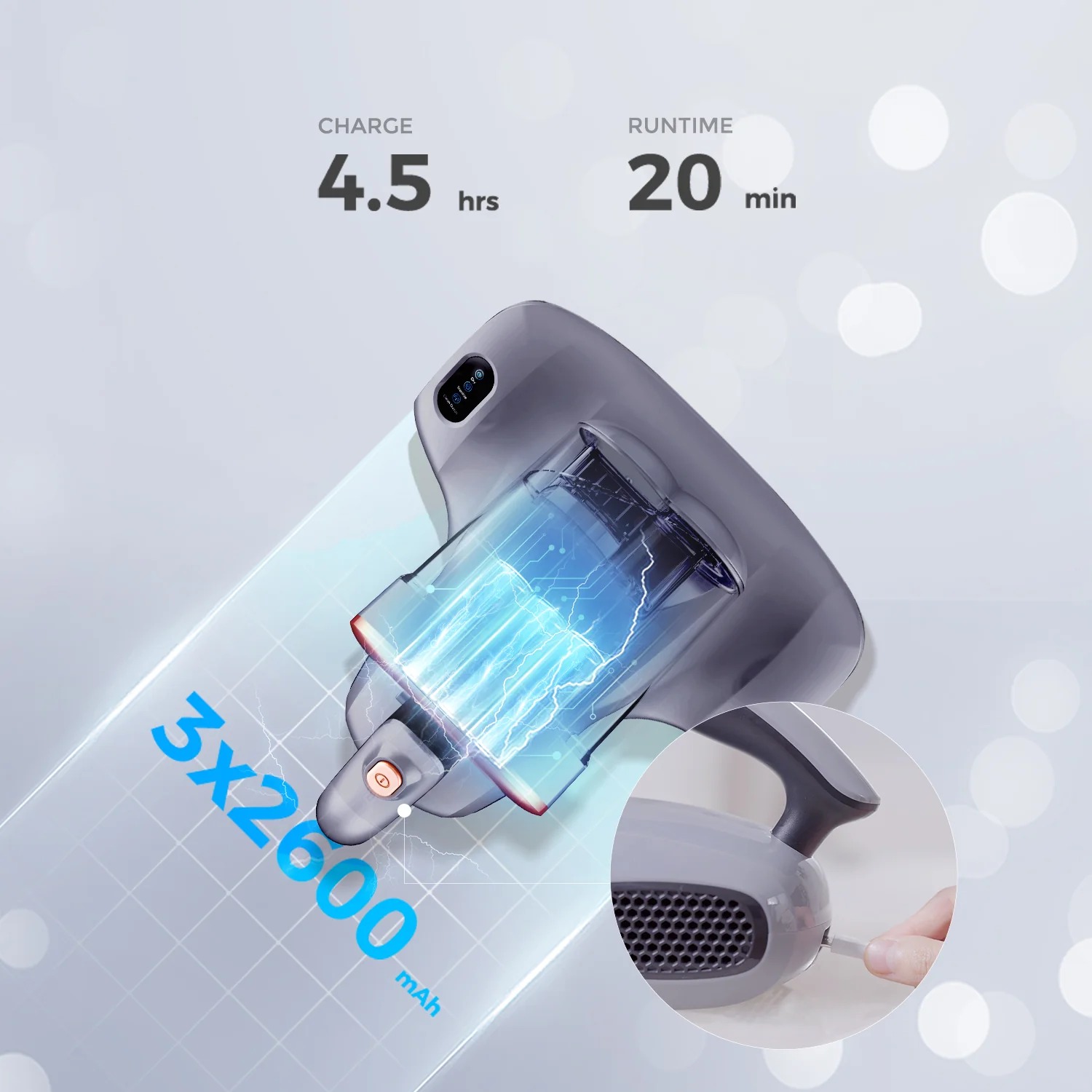 Der bürstenlose 150-W-Motor liefert 10.000 Pa Saugkraft. Gleichzeitig erzeugt das spezielle Kammerdesign 80.000 Vibrationen pro Minute – genug, um selbst tief in Matratzen- und Polsterfasern sitzenden Schmutz, Milben und Allergene zuverlässig zu lösen und abzusaugen. Zwei Saugöffnungen und die verlängerte Reinigungsstange sorgen für eine gründliche Reinigung großer Flächen.