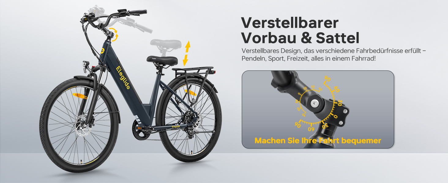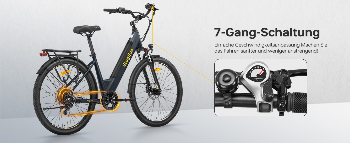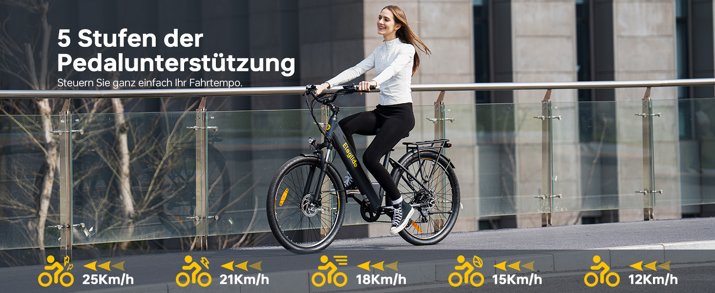 Das integrierte LCD Display zeigt wichtige Fahrdaten wie Geschwindigkeit, zurückgelegte Strecke und Akkustand an. Über fünf Unterstützungsstufen bis 25 km/h und einen 6 km/h Schiebemodus lässt sich das Fahrverhalten flexibel anpassen. Zusätzlich bietet die Eleglide App Funktionen wie Fahrradverriegelung, Passwortschutz und individuelle Einstellungen.