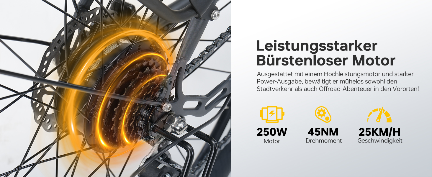 Der bürstenlose Motor liefert bis zu 45 Nm Drehmoment und unterstützt zuverlässig beim Beschleunigen sowie bei Steigungen. Mit einer maximalen Geschwindigkeit von 25 km/h bietet das E-Bike eine ausgewogene Kombination aus Leistung und Effizienz für Stadtverkehr und Freizeitfahrten.