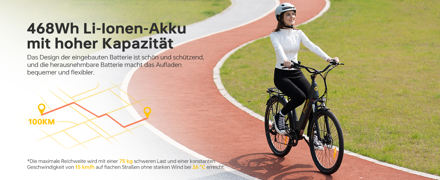 - 100 km Reichweite – Der herausnehmbare 486Wh Akku ermöglicht lange Fahrten im Unterstützungsmodus ohne häufiges Nachladen.