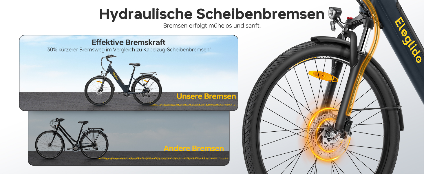 - Hydraulische Scheibenbremsen – Bieten stärkere Bremsleistung und bis zu 30 % kürzeren Bremsweg für mehr Sicherheit im Stadtverkehr.