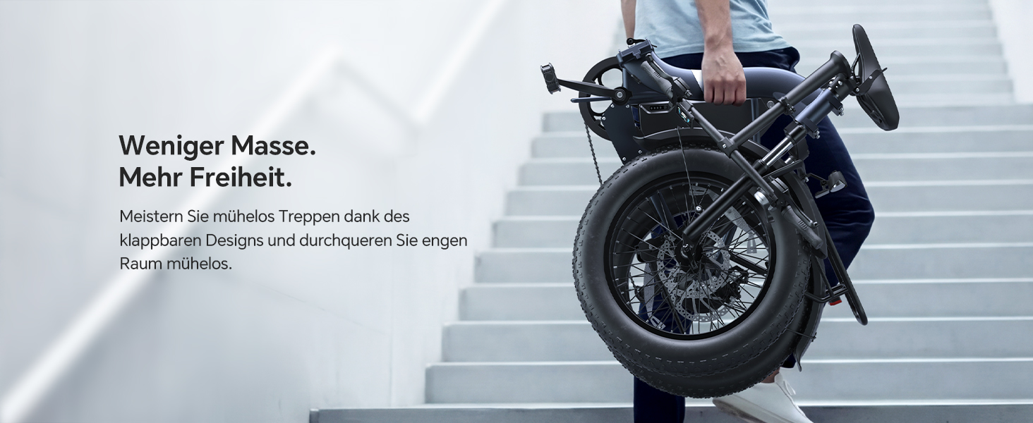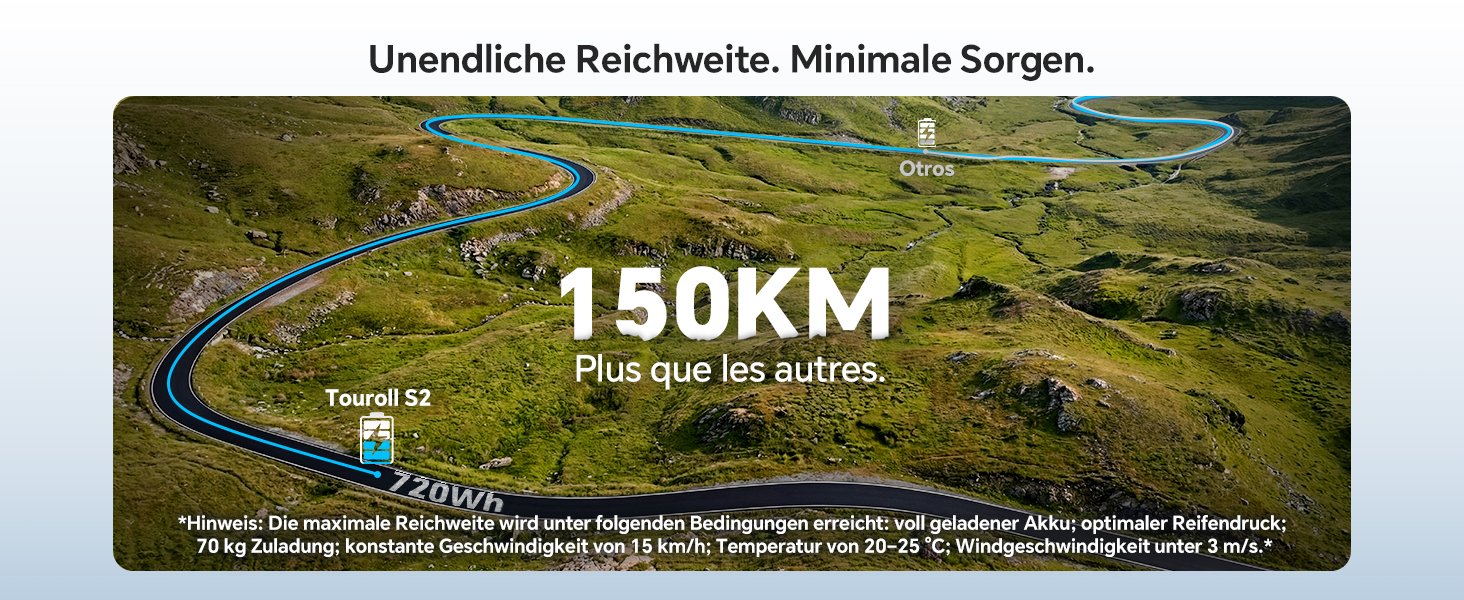 - Enorme Reichweite - Der 720Wh Akku ermöglicht Distanzen bis zu 150 km pro Ladung, ideal für ganztägige Einsätze oder lange Pendelstrecken.