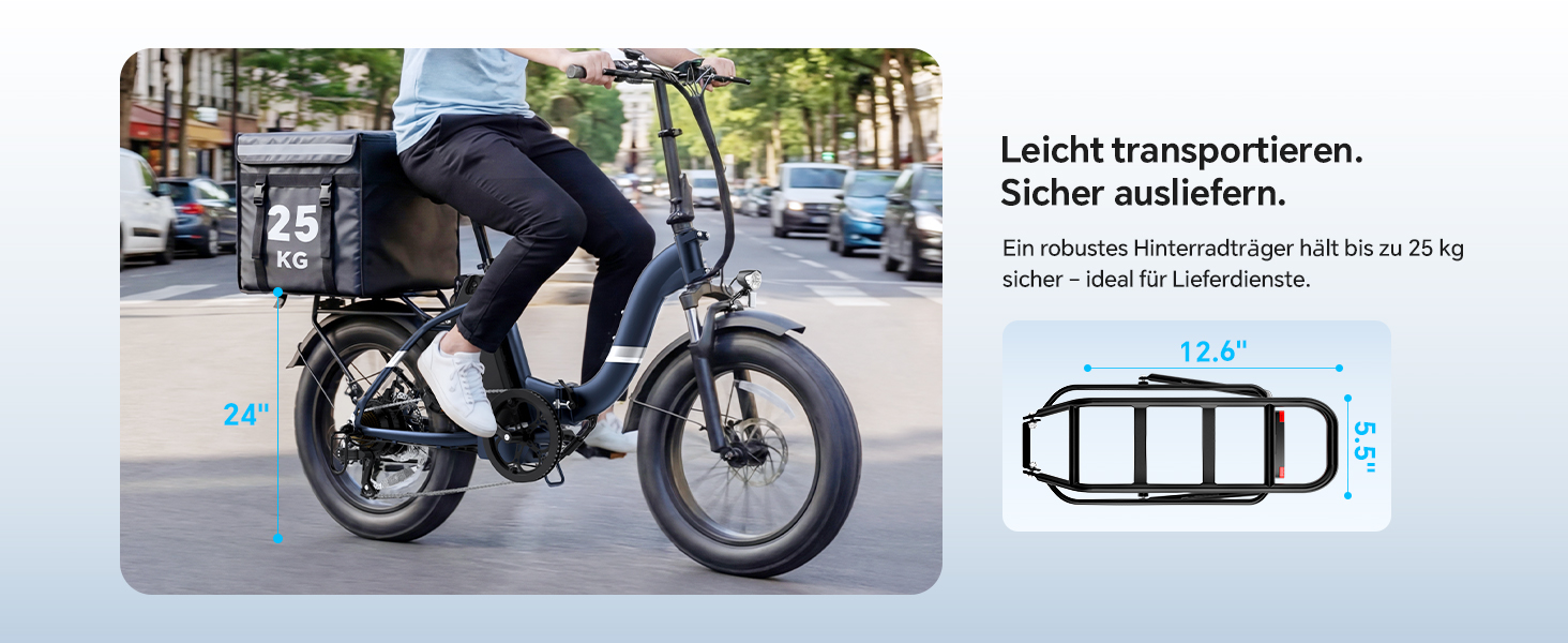 - Hohe Traglast - Ein robuster Heckgepäckträger für bis zu 25 kg Last macht das Bike zum perfekten Partner für Einkäufe oder Lieferdienste.