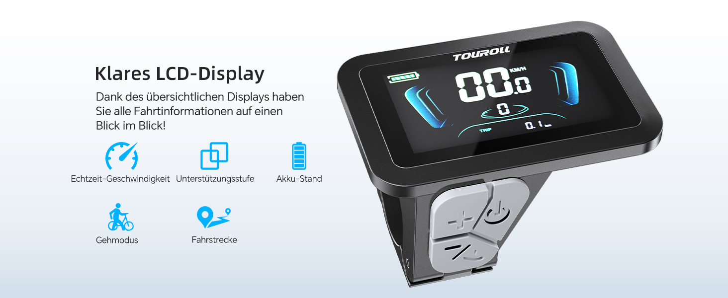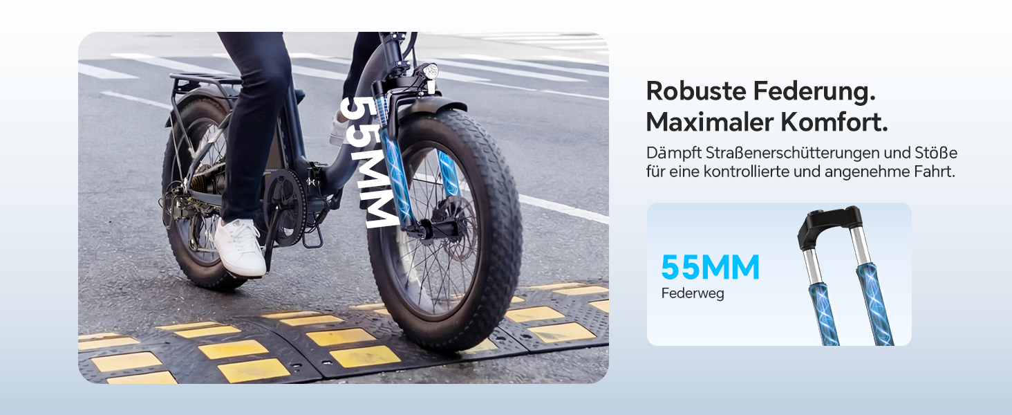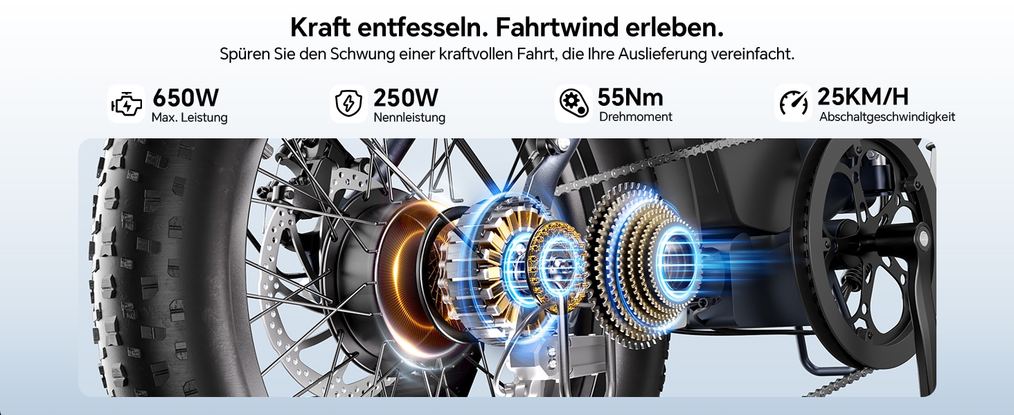 Der legale 250W Motor des Touroll S2 erreicht eine Spitzenleistung von 650W und liefert 55 Nm Drehmoment, um Steigungen und unwegsames Gelände souverän zu bewältigen. Die 20x4,0 Zoll Fat-Tires sorgen dabei für eine breite Auflagefläche und hohe Traktion auf losem Untergrund wie Sand oder Schnee, während sie im Stadtbild für einen markanten Auftritt und zusätzliche Fahrstabilität sorgen.