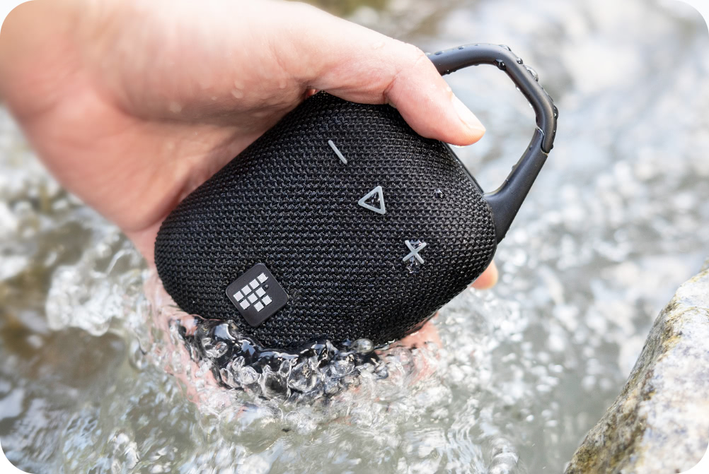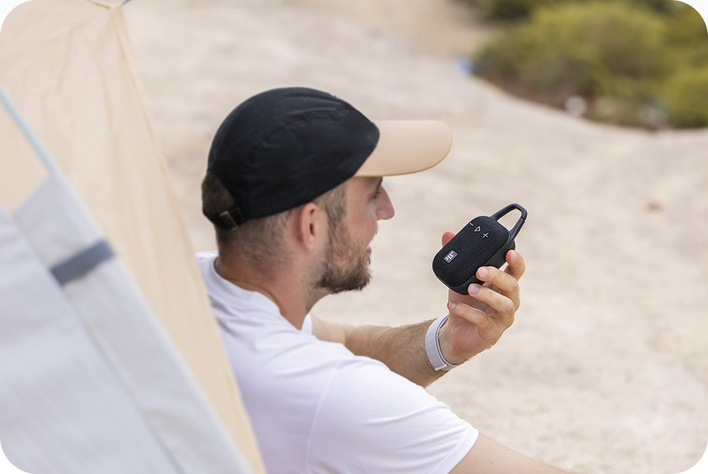 - Integrierter Karabiner – Lässt sich am Rucksack, Gürtel oder Zelt befestigen, damit der Lautsprecher immer griffbereit bleibt.