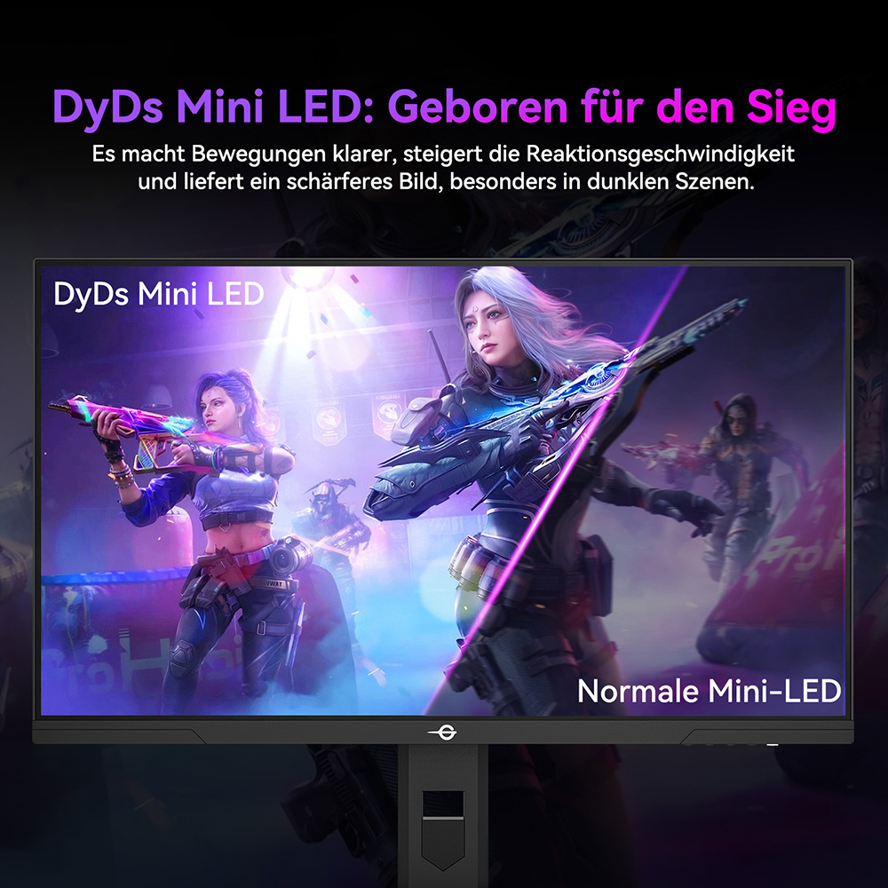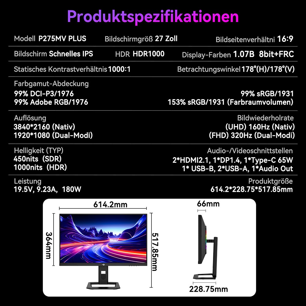 Der TITAN ARMY P275MV PLUS setzt neue Maßstäbe: Das Mini-LED-Panel mit 1152 unabhängigen Dimmzonen liefert tiefes Schwarz und hohen Kontrast. Dank Dual-Modus schalten Sie per Knopfdruck zwischen 4K@160Hz (für brillante Details) und FHD@320Hz (für maximale Reaktionsfähigkeit) um. DyDs-Technologie optimiert die Darstellung für FPS, MOBA oder 3A-Spiele. HDR1000, 96% DCI-P3 und ΔE<2 sorgen für farbgetreue, lebendige Bilder. Inklusive ergonomischem Standfuß, RGB-Beleuchtung und praktischem TITAN Widget Tool.