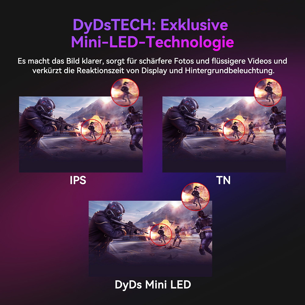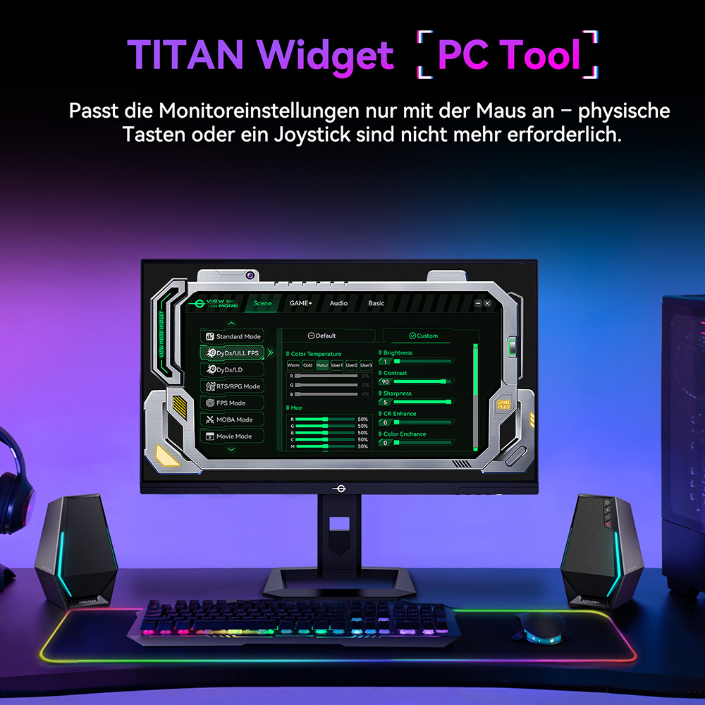 Der TITAN ARMY P275MV PLUS setzt auf modernste Mini-LED-Technologie. Tausende winziger LEDs bilden die Hintergrundbeleuchtung, gesteuert über 1152 unabhängige Dimmzonen. Das Ergebnis: präzise Helligkeitssteuerung, herausragende Gleichmäßigkeit und ein Kontrast, der weit über herkömmliche IPS-Panels hinausgeht. Die DyDs-Technologie (Dynamic Dimming System) verbessert zudem die Darstellung in dunklen Szenen und sorgt für gestochen scharfe Bewegungen. Mit dem TITAN Widget Tool passen Sie alle Einstellungen bequem per Maus an – ganz ohne lästige Tasten am Monitor.