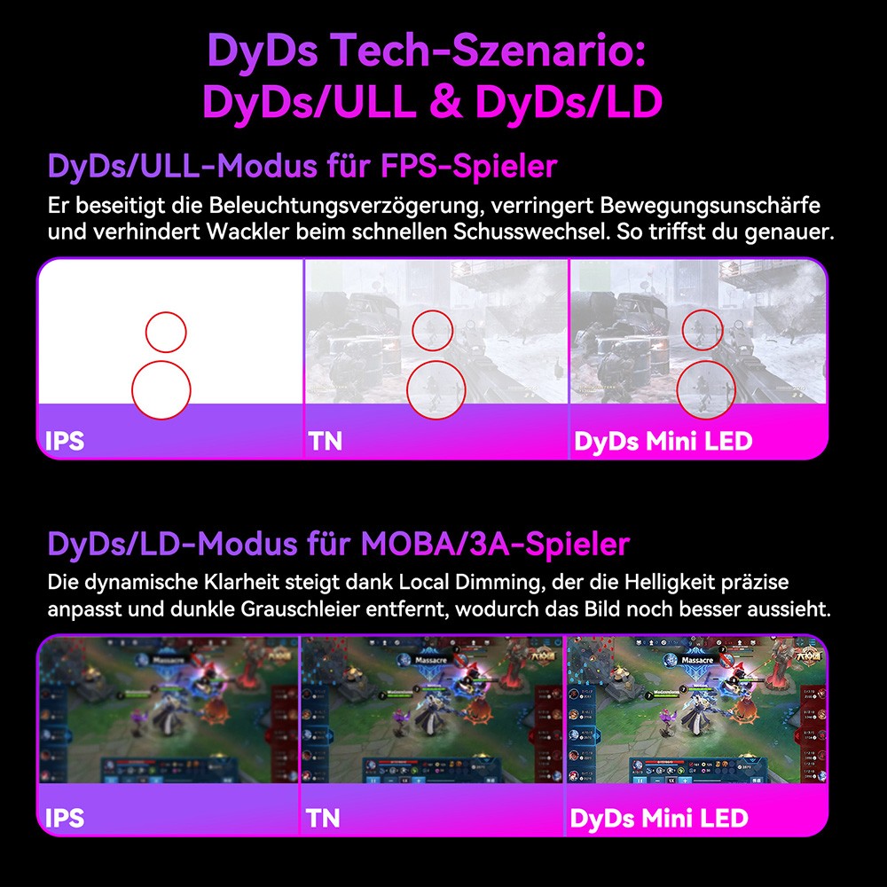 DyDs/ULL-Modus: Ideal für kompetitive Shooter (FPS). Er reduziert Bildwackeln und Bewegungsunschärfe – für präzises Zielen und bessere Übersicht im Gefecht.