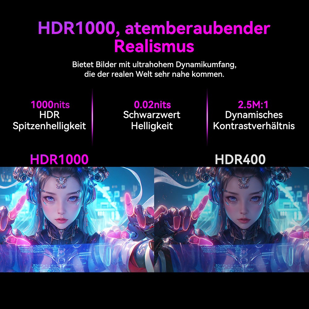 Mit einer Farbgenauigkeit von ΔE<2, 153% sRGB-Farbvolumen und 96% DCI-P3-Abdeckung liefert der Monitor eine professionelle Farbwiedergabe. Die 8-Bit+FRC-Technologie ermöglicht 1,07 Milliarden Farben für weiche Verläufe. HDR1000 hebt Helligkeit und Dynamik auf ein neues Niveau: Lichte Bereiche strahlen, ohne auszubrennen, dunkle Szenen bleiben detailreich – echte Kinostimmung fürs Wohnzimmer.
