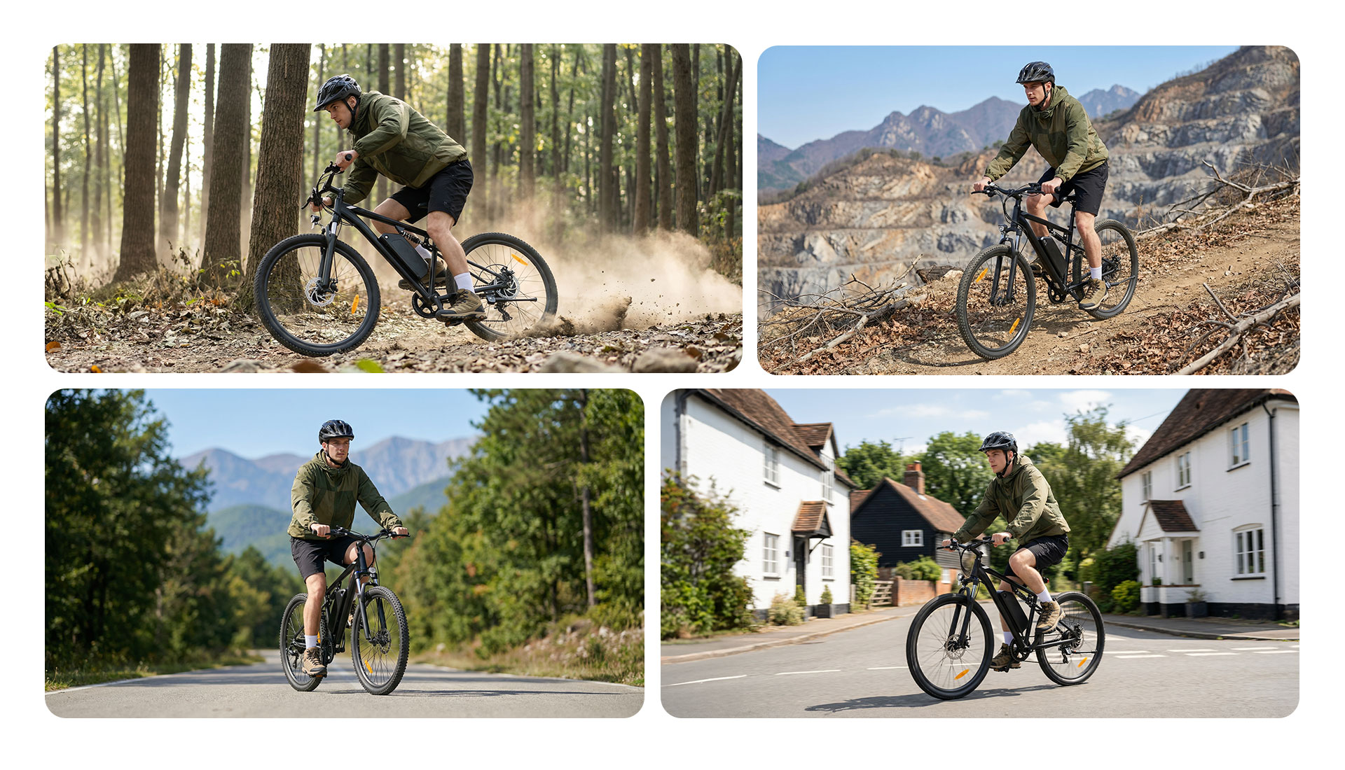 Die Kombination aus 80‑mm Federgabel und einstellbarer Hinterradfederung reduziert Schläge und Vibrationen auf Schotter, Waldwegen und schlechten Stadtstraßen. Das verbessert den Bodenkontakt und sorgt für ein ruhigeres Fahrgefühl, besonders auf längeren Strecken. Der Lockout an der Gabel ist praktisch, wenn auf Asphalt effizienter gefahren werden soll.