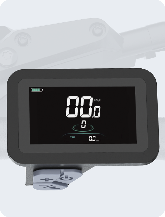 Anzeige von Geschwindigkeit, Akkustand und Fahrmodus.