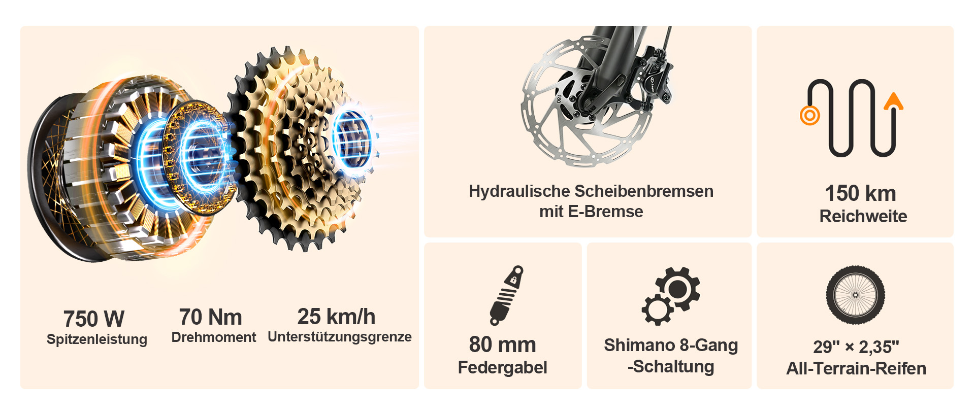 - 750W Peak & 70 Nm Drehmoment – Erleichtert Anfahren, Steigungen und Stop-and-go im Stadtverkehr.