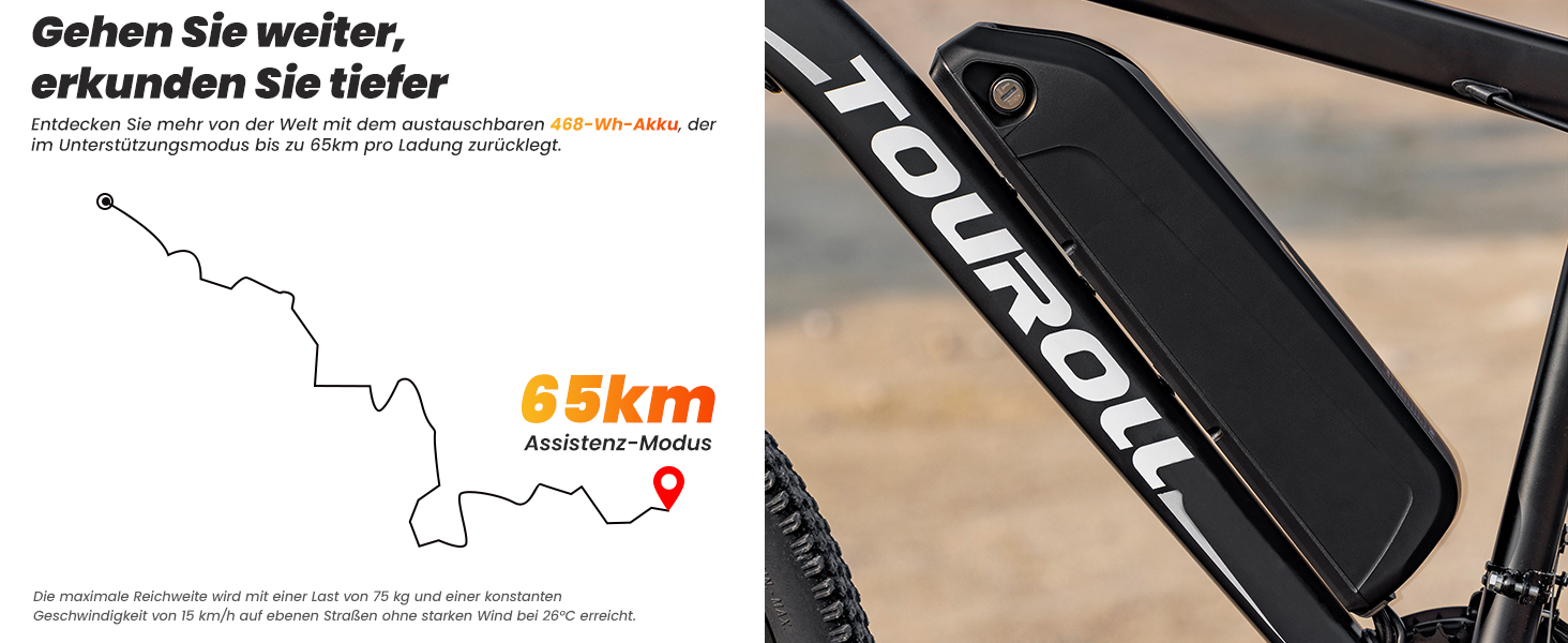 - 468Wh Wechselakku – Die hohe Kapazität ermöglicht Reichweiten von bis zu 65 km im Assist-Modus für sorgenfreie Pendelstrecken und Ausflüge.
