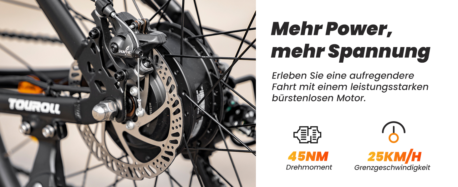 - 450W Spitzenleistung – Der bürstenlose 250W Motor liefert bis zu 45Nm Drehmoment für müheloses Anfahren und zuverlässige Unterstützung bei Steigungen.
