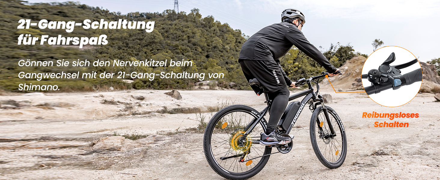 - 21-Gang Shimano Schaltung – Das präzise Schaltsystem bietet eine feine Abstimmung für jedes Terrain und maximiert die Effizienz der eigenen Tretleistung.