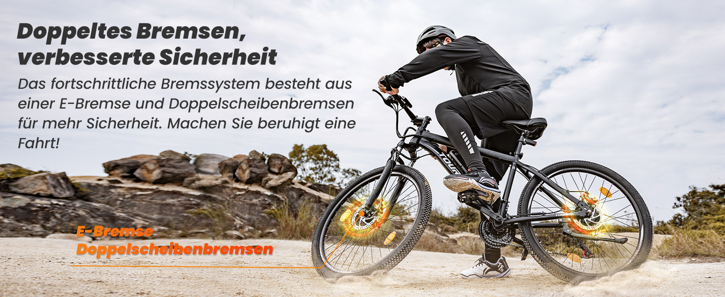 Für maximale Sicherheit ist das E-Bike mit mechanischen Scheibenbremsen ausgestattet, die durch eine elektronische Abschaltfunktion (E-Brake) ergänzt werden. Sobald die Bremshebel betätigt werden, unterbricht das System die Motorunterstützung sofort. Dies verkürzt den Bremsweg spürbar und erhöht die Kontrolle bei Nässe oder unvorhersehbaren Situationen.