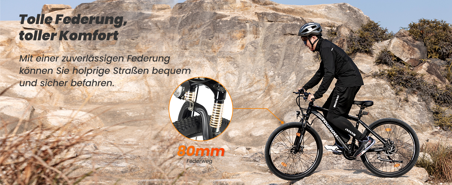 - 80mm Federgabel – Die robuste Vorderradfederung absorbiert Stöße und Vibrationen effektiv, was den Fahrkomfort auf unebenen Waldwegen und Kopfsteinpflaster deutlich erhöht.