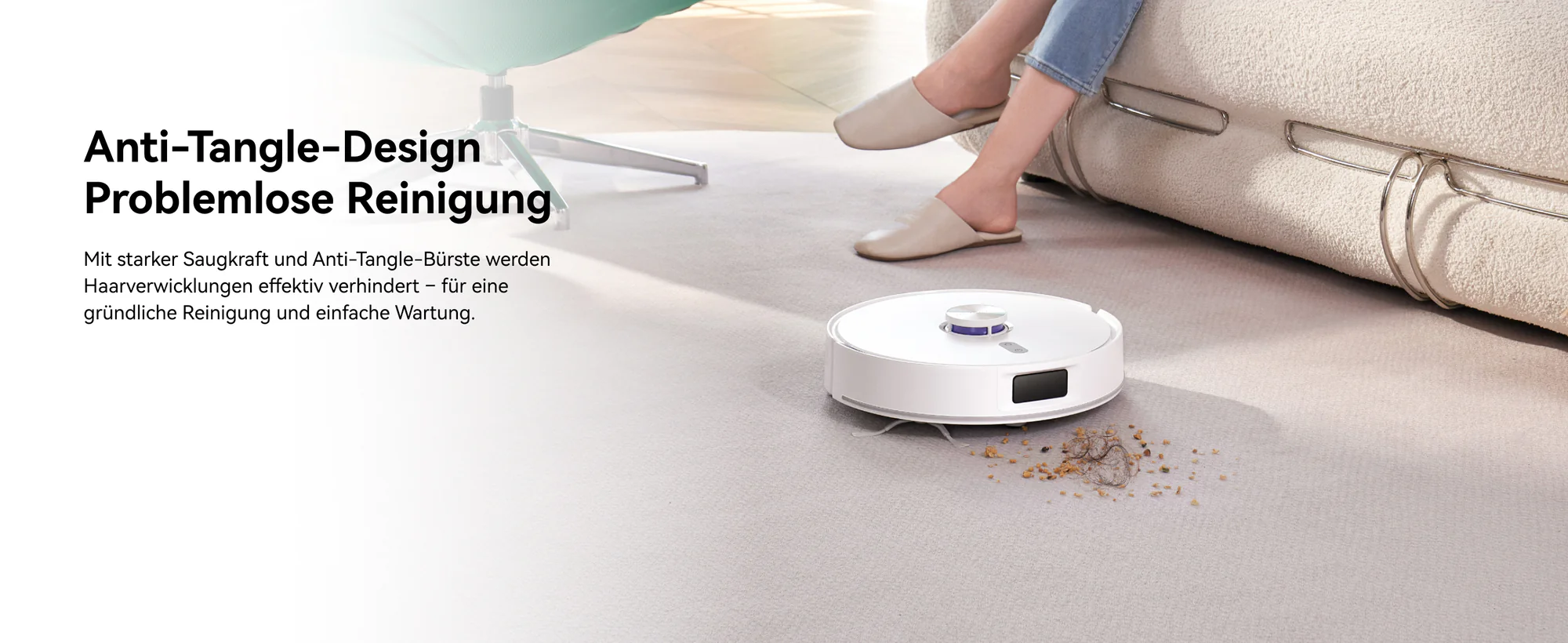 Mit einer starken Saugleistung von 8000Pa und vier einstellbaren Saugstufen entfernt der Freo S selbst feinste Partikel. Ob Tierhaare, Katzenstreu, Hundefutter oder Krümel – der Roboter saugt zuverlässig Teppiche und Hartböden gründlich sauber. Die Absaugrate von ≥99% sorgt für konstante Reinigungsergebnisse, ideal für Haushalte mit hohen Ansprüchen oder Tierhaaren.