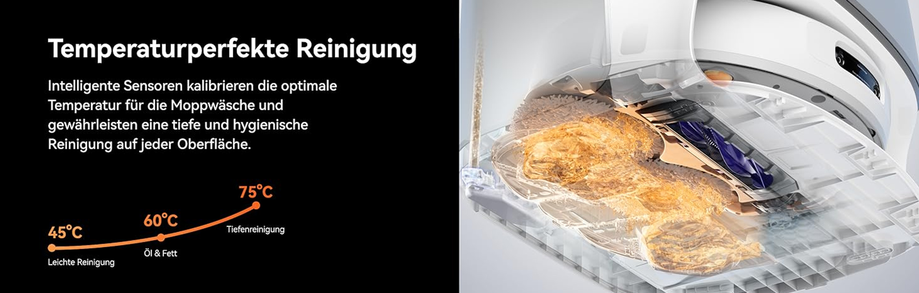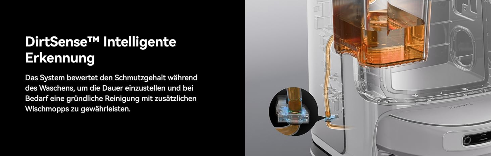 Die Doppelmopps arbeiten wie eine Handbewegung – sie schrubben den Boden gezielt, bis selbst eingetrocknete Flecken wie Ketchup oder Kaffee verschwinden. Der integrierte Schmutzsensor prüft dabei permanent, ob noch Rückstände vorhanden sind. Erst wenn der Boden wirklich sauber ist, hört der Roboter auf zu wischen.