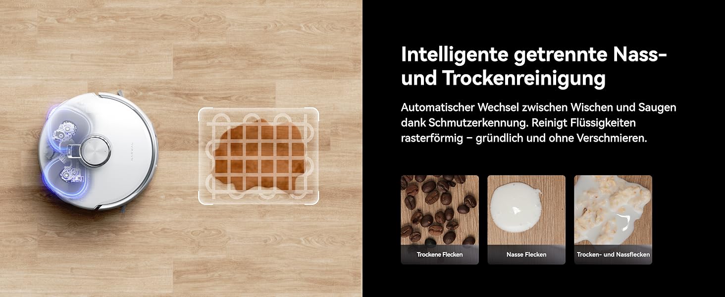 Der Roboter erkennt automatisch, ob es sich um nasse oder trockene Verschmutzungen handelt. Flüssigkeiten werden von den Reuleaux-Dreiecksmopps mit 8N Anpressdruck in einem Raster aus 6 Reinigungszyklen aufgenommen. Trockener Schmutz wird durch automatische Anpassung der Saugkraft entfernt. Erkennt der Roboter Teppiche, hebt er die Mopps um 12 mm oder die Hauptbürste an – für optimale Reinigungsergebnisse auf Hartböden und Teppichen gleichermaßen.