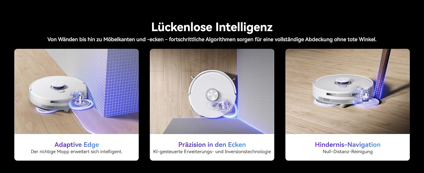 Die Mopps fahren bei Bedarf intelligent aus und reinigen selbst in 0 mm engen Lücken. Gleichzeitig erkennt der Roboter Kabel und Kleinteile ab einer Größe von 8 mm und umfährt sie zuverlässig. Endlich werden auch Kanten und Ecken gründlich sauber – genau so, wie Sie es erwarten.