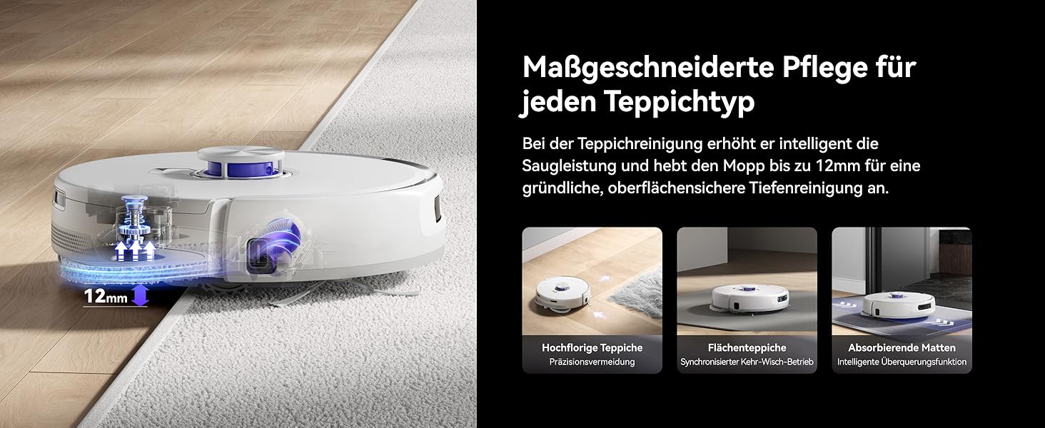 Der Roboter erkennt, was vor ihm liegt – und reagiert sofort. Ob Kabel, Schuhe oder Teppichkante: Er navigiert intelligent hindernisfrei und reinigt dort, wo es nötig ist.