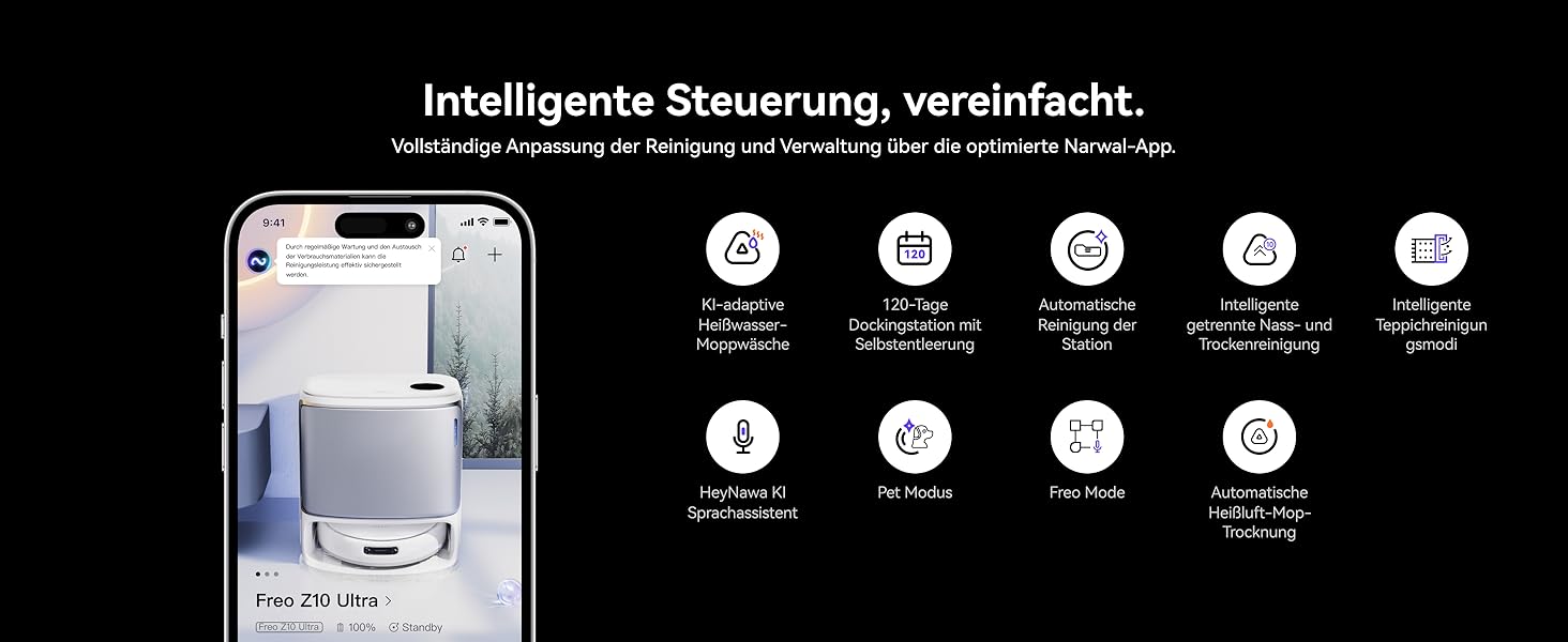Der NARWAL Freo Z10 Ultra lässt sich bequem über die Smartphone-App steuern. Die schnelle Raumkartierung erfasst Ihre Wohnung zuverlässig, während Sie individuelle Reinigungsstrategien festlegen können. Über intelligente Sprachbefehle passen Sie die Reinigung jederzeit an Ihre Bedürfnisse an – ganz ohne manuelles Eingreifen. So wird die Reinigung genau so durchgeführt, wie Sie es wünschen.