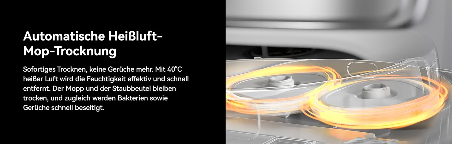 Die Station übernimmt die komplette Reinigungspflege: Sie wäscht die Mopps dynamisch, trocknet sie mit Heißluft und eliminiert Bakterien zuverlässig. Der Staubbeutel muss nur etwa alle 120 Tage gewechselt werden – für bis zu vier Monate sorgenfreie Reinigung.