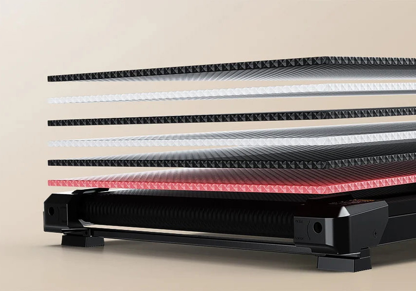 Die Lauffläche von 16,1" × 39,37" bietet Platz für natürliche Schritte. Ein 6‑lagiger Anti‑Slip‑Gurt in Kombination mit 10 Silikon-Stoßdämpfern und 2 Cushion-Pads reduziert Vibrationen und Aufprallkräfte. Das unterstützt ein gelenkschonendes, gleichmäßiges Laufgefühl – insbesondere bei regelmäßigen Einheiten.