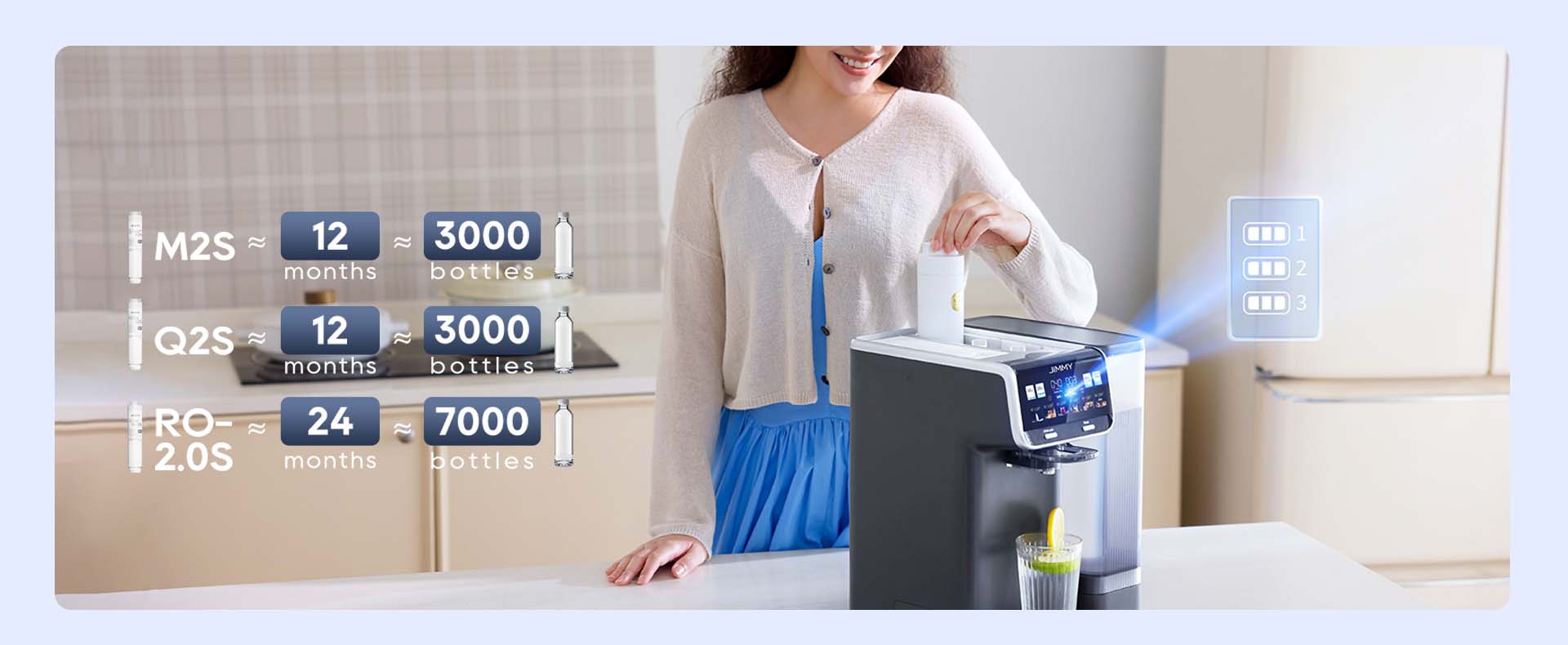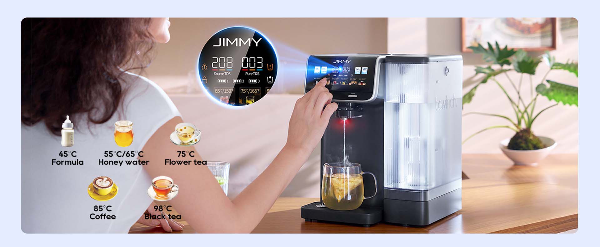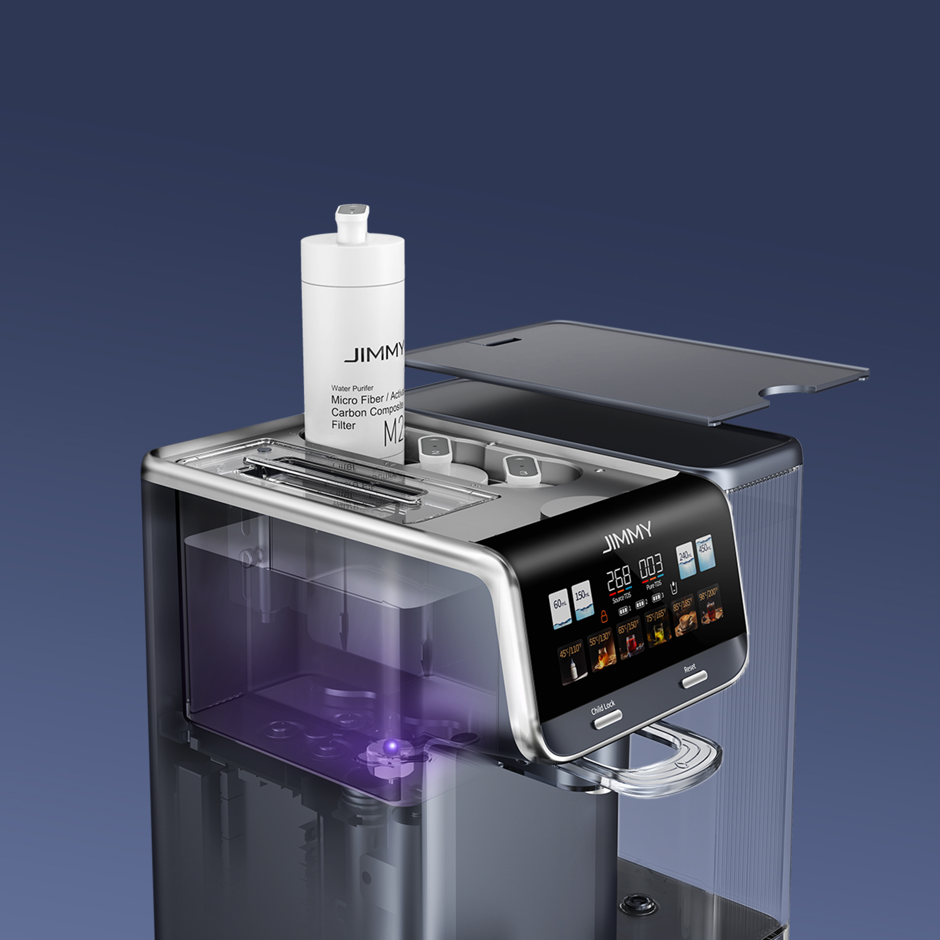 Das JIMMY Matrix M9 Pro ist ein leistungsstarkes Umkehrosmose-Wasserfiltersystem für die Arbeitsplatte. Das System kombiniert mehrstufige Filtration, schnelle Heißwasserbereitung und ein modulares Erweiterungssystem. Dank der AquaLink-Technologie kann das System mit dem JIMMY Matrix S9 Sprudelwassermodul oder dem JIMMY Matrix I9 Eisbereitermodul erweitert werden und verwandelt die Arbeitsfläche in eine vielseitige Getränkestation.