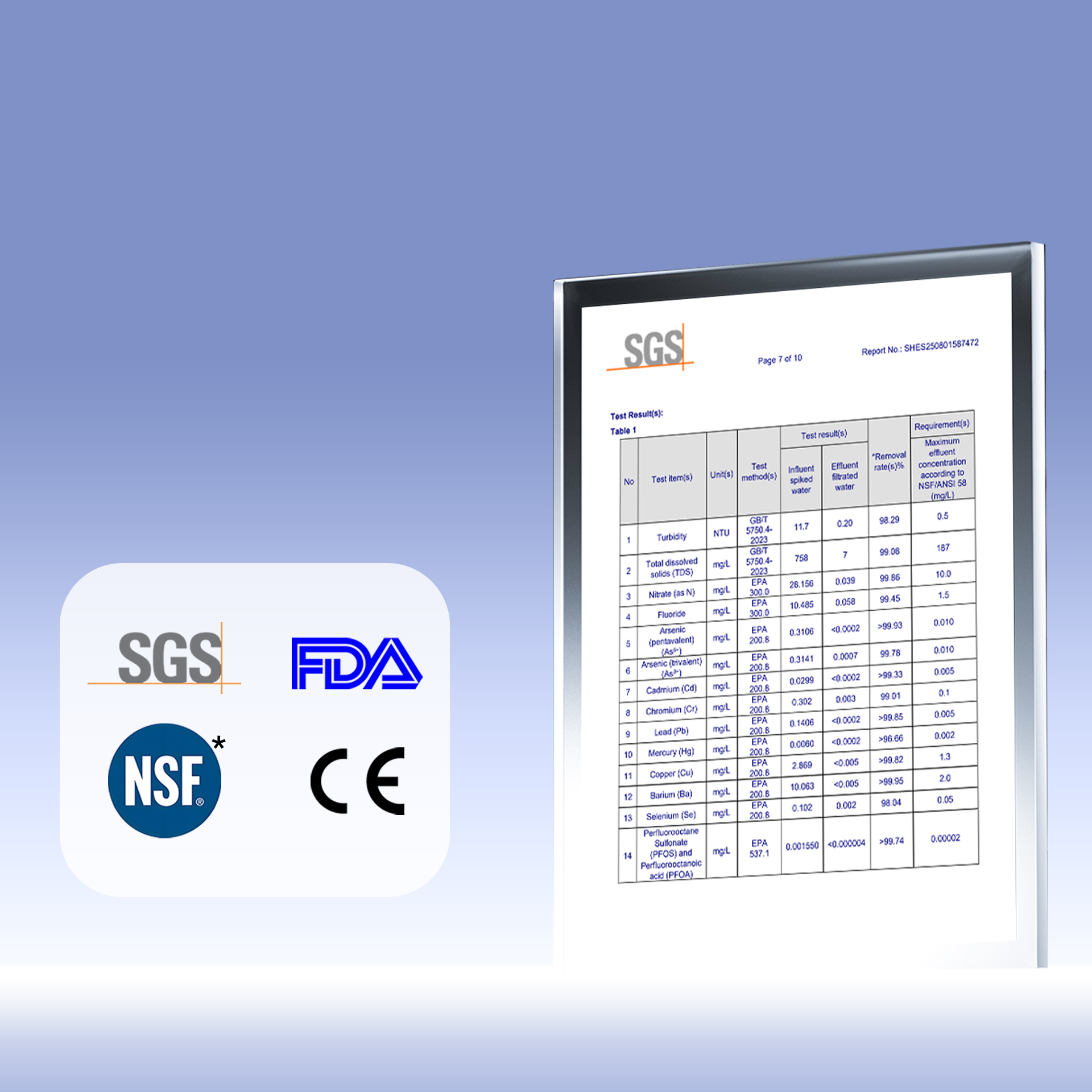 - 7-stufige RO-Filtration – Entfernt bis zu 99,99 % von Verunreinigungen wie Schwermetallen, PFAS und Chlor und sorgt für sauberes Trinkwasser.