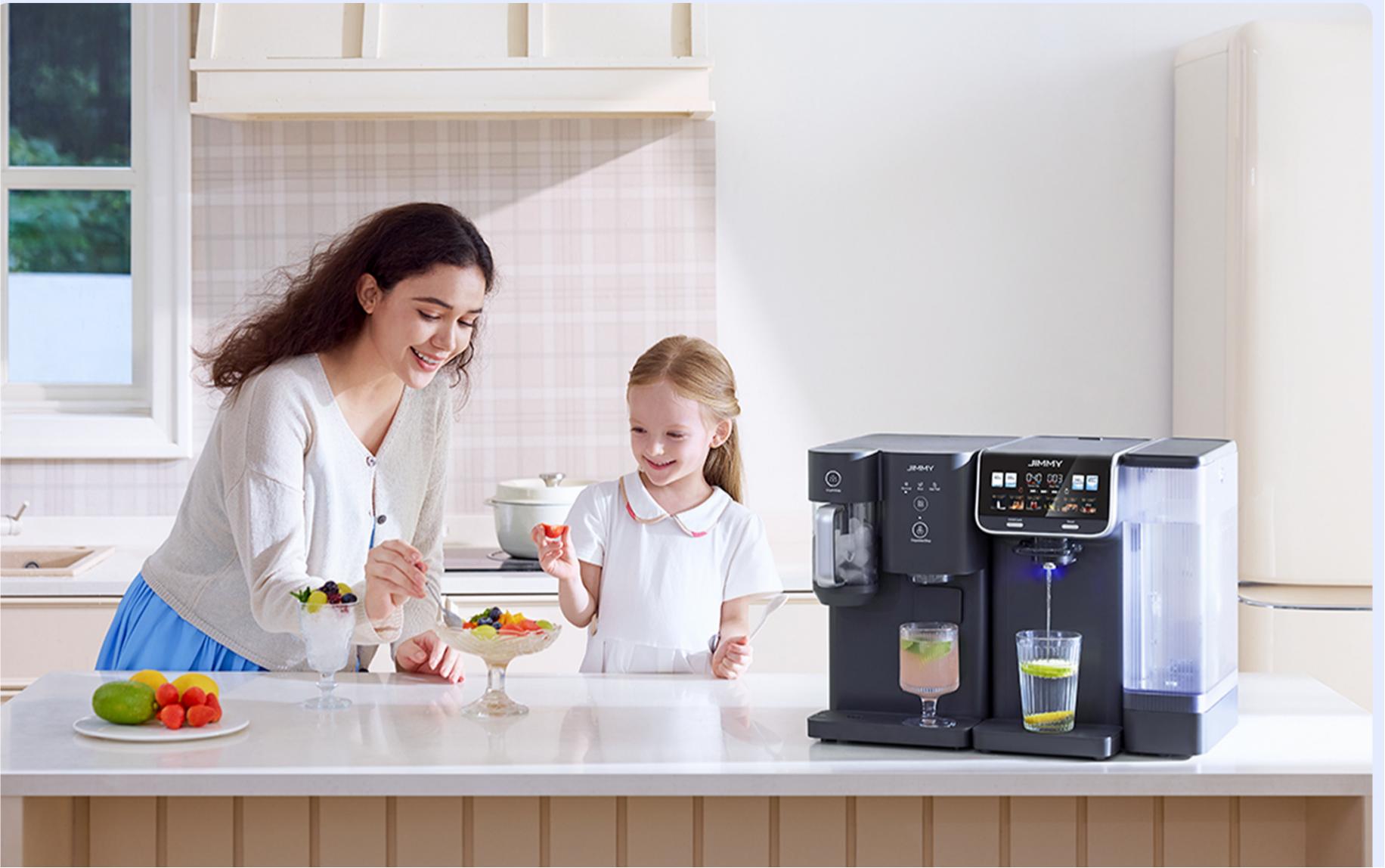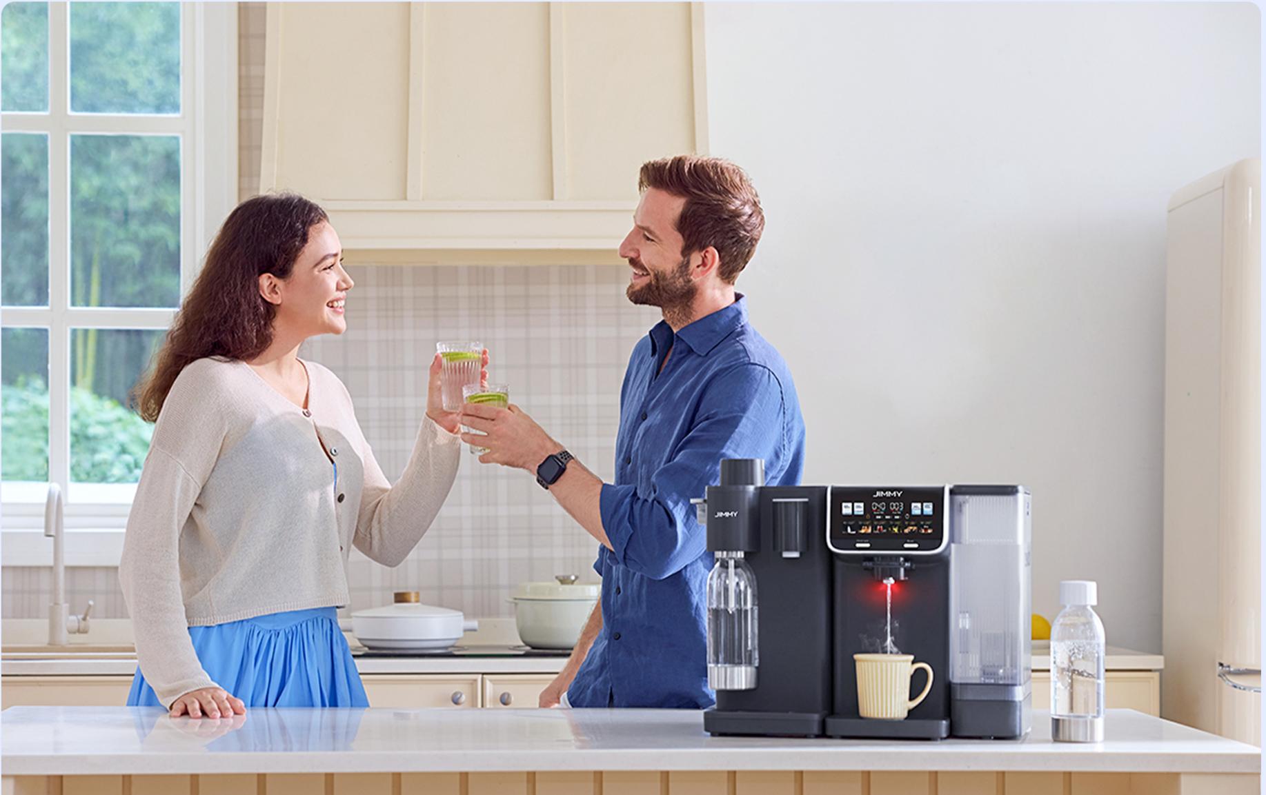 Das JIMMY Matrix M9 Pro dient als zentrale Einheit des modularen AquaLink-Systems. Über die Schnittstelle können zusätzliche Module wie der JIMMY Matrix S9 Wassersprudler oder der JIMMY Matrix I9 Eisbereiter angeschlossen werden. Dadurch entsteht eine kompakte Getränkestation für gefiltertes Wasser, Sprudelwasser und Eis.